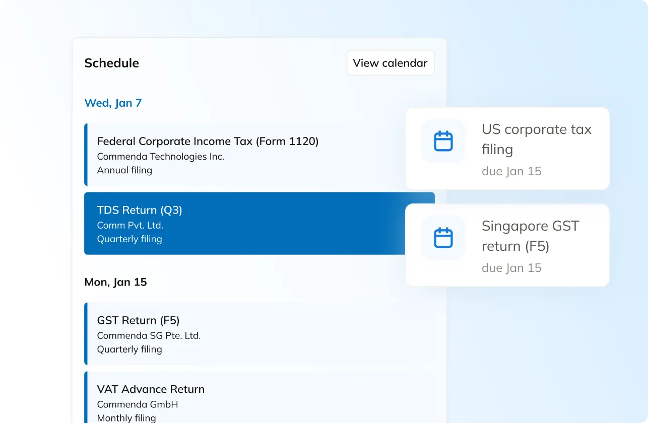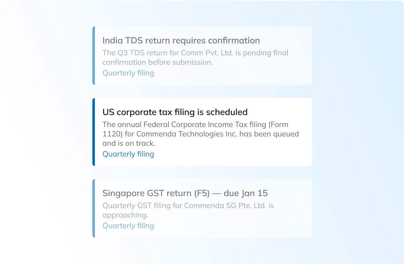 Commenda generates up to date compliance calendar for every jurisdiction—mapping annual returns, VAT/GST deadlines, franchise taxes, and renewals. The platform monitors each requirement and alerts your team before anything becomes overdue. Filings and confirmations are stored directly in the entity record for easy auditing.